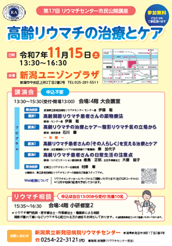 2025年11月15日(土)に、新潟市の新潟ユニゾンプラザで市民公開講座を開催しました。講演会とリウマチ相談のほか、展示コーナーも設置しました。